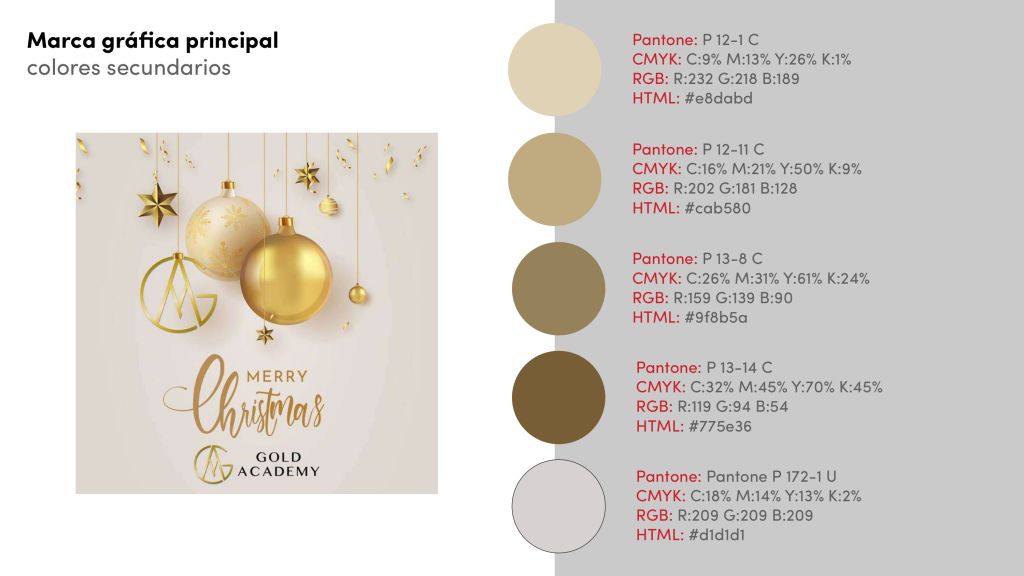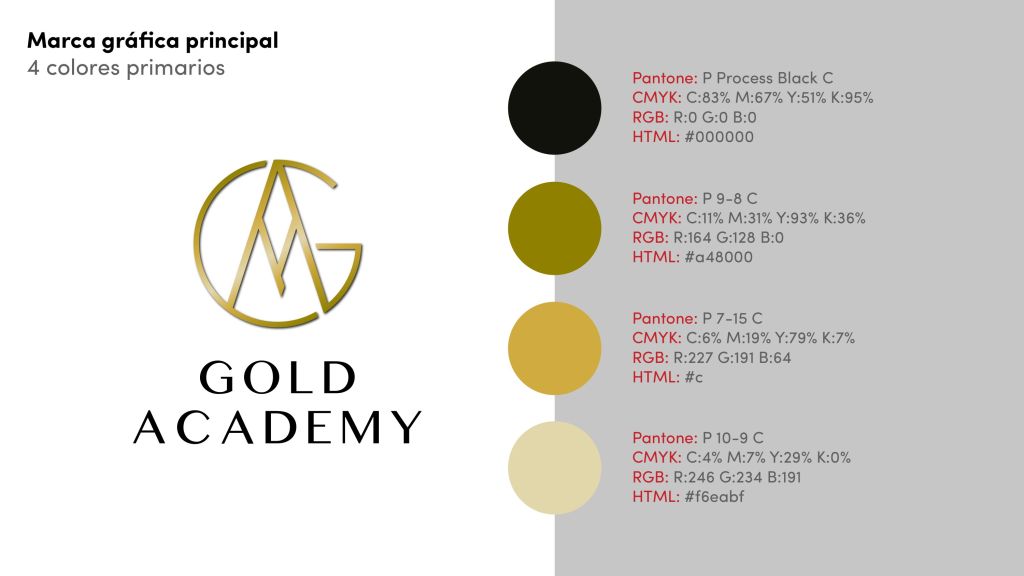 - Dorado: CMYK 10, 25, 90, 0 | RGB 234, 191, 51 | HEX #EABF33