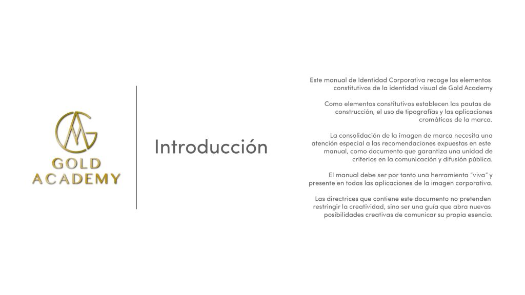 Ejemplo: “Gold Beauty Studio se dedica a ofrecer servicios de belleza de alta calidad, con un enfoque en la satisfacción del cliente y la innovación. Este manual de identidad establece las directrices para el uso correcto de nuestros elementos de marca, asegurando una presentación coherente y profesional en todos los canales.”